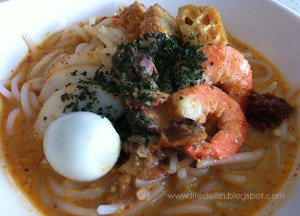 Once the stock was ready, it was strained, the rempah was added to it, left to simmer for some time, before the coconut milk was also added to it. Then I chopped more laksa leaves for sprinkling over the individual portions. I have observed that the aroma of laksa leaves is strongest when it is uncooked, just as with coriander. Therefore, although many laksa recipes seem to call for laksa leaves to be simmered in the stock, I actually think what is more important is to have chopped fresh laksa leaves sprinkled over the dish before serving, as this is what gives the dish most of its characteristic aroma, without which it would be just a bowl of spicy prawn and coconut soup.