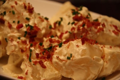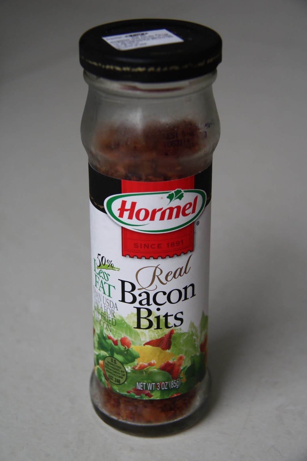If I don’t have 45 minutes, I boil the potatoes instead.  I put the potatoes in a pot and cover with water, add perhaps 2 tsp of salt to the water for every 6 potatoes, then boil for approximately 15 minutes till cooked. Then I peel, quarter and toss them in sour cream, top with bacon bits and chives (or spring onion).  I prefer to make my own bacon bits, but if I don’t have time or don’t have any bacon in the fridge, then I use Hormel Real Bacon Bits.  I stay clear of those bottles of purported bacon bits which taste nothing like bacon.
