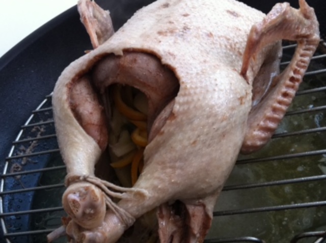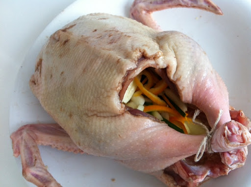 The next afternoon, I took it out of the fridge to stand at room temperature for an hour, then removed all the pieces of garlic from under and over the skin, patted the whole thing dry with paper towels again, stuffed the cavity with the garlic, some flat-leaved parsley (Italian parsley), a few springs of thyme, an onion cut into strips, 2 stalks of celery sliced, and an orange peel cut into strips.